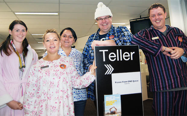 The staff at Kingaroy’s Commonwealth Bank definitely weren’t sleeping on the job today, despite the fact they were wearing their finest pyjamas while helping customers.