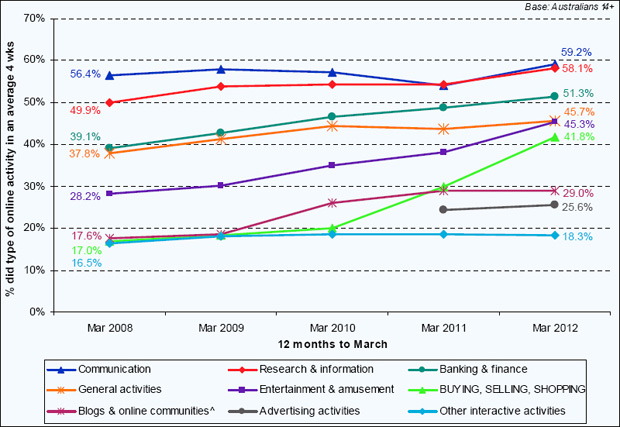 More than 4 out of 10 Australians aged 14-plus now do one or more “Buying, Selling, Shopping” activities online in an average four-week period.