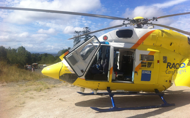 The 61-year-old female pillion passenger was flown by RACQ CareFlight to Royal Brisbane Hospital in a stable condition. She suffered injuries to her shoulder, collarbone and knee.