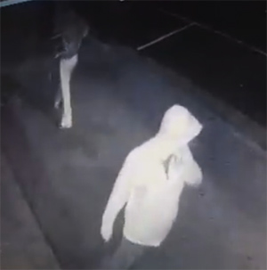 The video shows two youths or young men wearing hoodies walking up to the business.