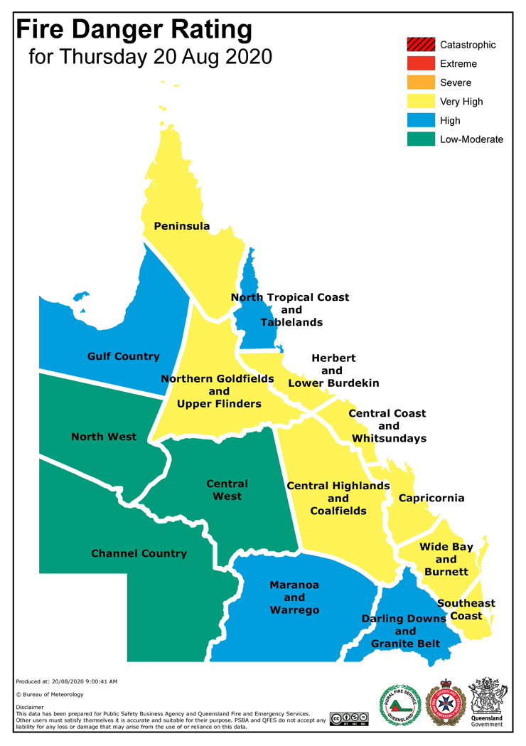 Bureau of Meteorology forecasts have listed the risk of fire in the Wide Bay Burnett as “very high” or “high” at least until Sunday.