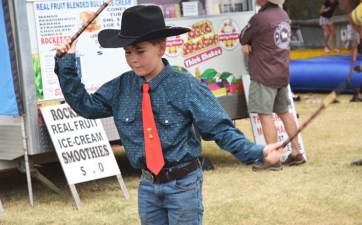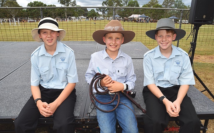 Wondai Town and District Band members Sean and Declan Andersen, from Cushnie, with whipcracking contest entrant Tom English, centre, from KingaroyAfter a solo demonstration with a bullock whip, Josh Lamping, 11, then impressed the judges with his double-handed turn in the 9-12-year-old whipcracking category