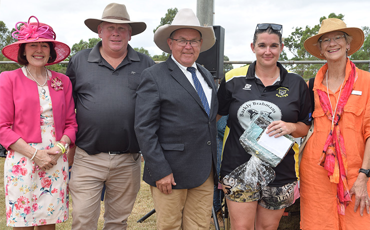 Jasmine Turner, from Proston, won the Open category in the whipcracking competition with an energetic display … from left, compere Mayor Kathy Duff, judge Cr Heath Sander, Colin Boyce MP, Jasmine and timer Cr Ros HeitProston Fire Brigade members Jason Maneylaws and Nathan Clark with Mondure Rural Fire Brigade 3rd Officer Russell SteerFirst place in the Lightweight Led Steers went to this four-month-old Red Angus x Limousin, “Cuddly” … with Mackenzie Daniels, Kingaroy; and Graeme Wicks, TingooraBub Kennedy, Murgon, and Margery Grimes, Boondooma, were taking a well-earned break on the pavilion verandahJacinta Rockemer, from Booubyjan, and “Destiny’s Sweet As Candy” took out the ribbon for Reserve Champion in the Australian Stock Horse competitionKahlia Paech, from Bundaberg, was presented with a trophy for Supreme Rider Of The Show … the new perpetual trophy is named in memory of the late Dan Retschlag and was presented to Kahlia by Jeff and Lorraine Retschlag, from WondaiMayor Kathy Duff presented the Supreme Miniature Horse of the Show sash to Teagan Wyles, of Taabinga, and “Shangi-La RM Bolero”Mayor Kathy Duff and Member for Flynn Colin Boyce with the Supreme Champion Stud Beef Cattle winner, “Hazelton Exhibit”, a 26-month-old Brahman bull shown by Stuart, Brett and Taylor Kirk from GayndahThe Wondai Town & District Band played the National Anthem at the show opening but also entertained the crowd