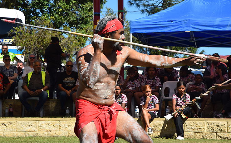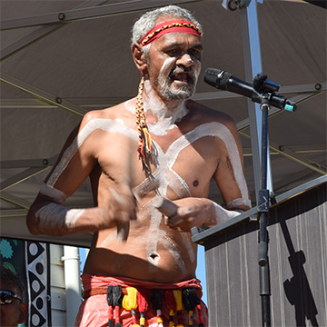 Cr Daniel Weazel leading the performance of the Wakka Wakka Dancers