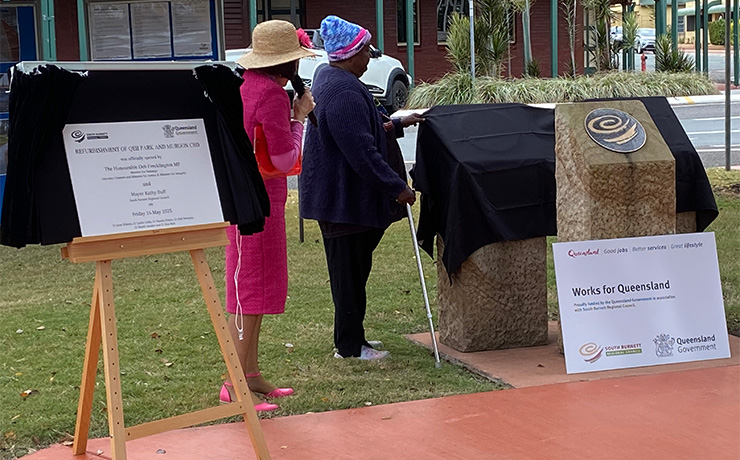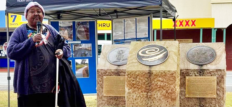 Two of the plaques were designed by well-known Cherbourg artist, Aunty Venus Rabbitt, who unveiled the plinths and explained their significance.