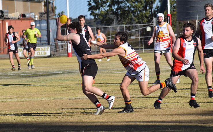 Australian Rules fans turned out in good numbers at Lyle Vidler Oval in Kingaroy last Saturday to watch the South Burnett Saints take on the University Cougars in all three grades.