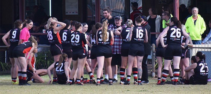 Saints’ senior women suffered a narrow defeat, with both teams kicking three goals apiece: Cougars 3.9-27 to 3.3-21.