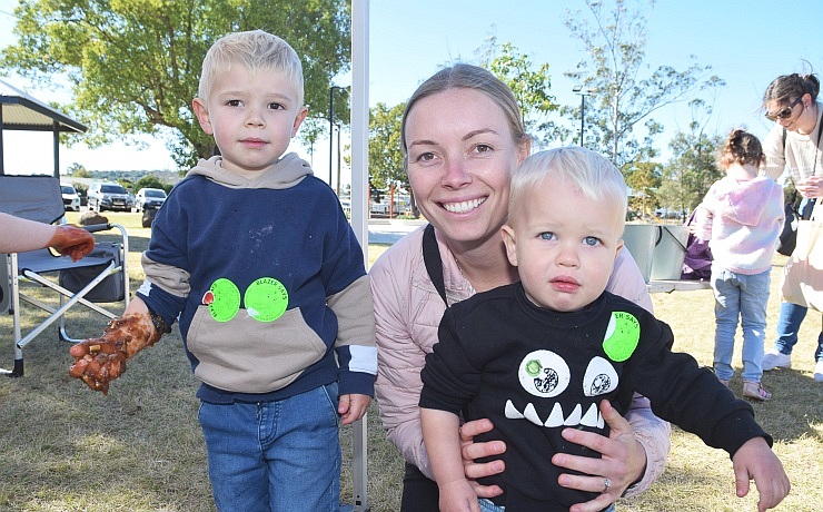 South Burnett Partnerships For Kids’ Jacquie Grosskopf and Peta Clarkson … the pair organise the annual Under 8s Day in KingaroyRylan, 3, and Zaiden 1, with mum Erin Ogden, from Tingoora … the brothers were having fin with Graham House’s yucky lucky dipAdvanced Care Paramedics Savannah Noble and Katelyn Major with Kingaroy Local Ambulance Committee secretary Kay Dove, centreMaverick Black, 4, might save someone’s life one day! Young Maverick was learning about CPR from Kingaroy QAS Acting Officer-in-Charge Renae Birch and Kingaroy LAC vice-president Darryl DoveKingaroy men’s Shed members were catching up with some of the local councillors … from left, Tom Johnson, Mayor Kathy Duff, Cr Linda Little, Eric Ford, Cr Deb Dennien and Geoff Wood (the Men’s Shed members were also teaching children a very useful skill – how to drive in a nail properly!)Tayler McBrien, from South Burnett CTC, was helping out with games on the CTC stallBacon Man dropped in, off course, to add some sizzle … ably assisted by BaconFest volunteer Tracy GoldsmithDeadly Kindies duo Hayley Matthew and Latoya Enoch were explaining the positive benefits of kindergartensSandy Ridges Rural Fire Brigade members – and Voluntary Community Educators – Vanessa Bywaters and Georgia White were sharing bushfire safety tips (and lots of stickers!)Memorial Park in Kingaroy was very, very busy on Thursday morning for the annual Under 8s Day