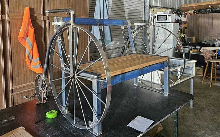 The bench, which echoes a penny farthing bicycle, is being made by the Wondai Men’s Shed and will be located in Wondai’s Coronation Park when it is completed.