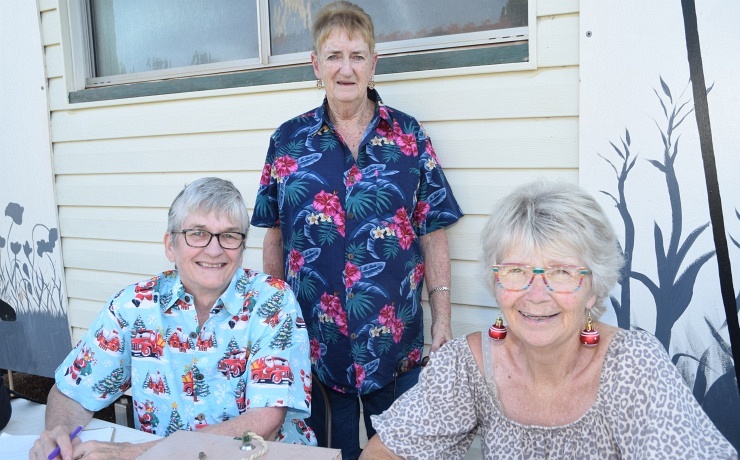 Nanango Men’s Shed volunteers … from left, Herman Lette, Grant Watson and Roy McKeeBelinda Hadley-Wells and Janet Margaret were getting into the Christmas spiritGrace Wells and Neil Melville, from Nanango, were relaxing under the shade sailsLauren and Jayden Flint, from Nanango, were dressed for festive funNatalie Fenton was encouraging crowd members to sing, and also creating giant bubbles to amuse the youngstersThe NaTDA Heritage Nanango choir sang on the lawn and also performed carols in the old churchSanta was making friends with Jane Hodgkinson and her granddaughter, Maggie Jane Hodgkinson-Jones, 2Jenny and Rod Morgan were chatting with South Burnett Mayor Kathy Duff … Mayor Duff also brought a long a suite of games for the children to playPart of the rock’n’roll dance crew … from left, Diane Musgrave, Nanango; Greg Wagner, Yarraman; and Rhonda and Terry Mackrell, Nanango