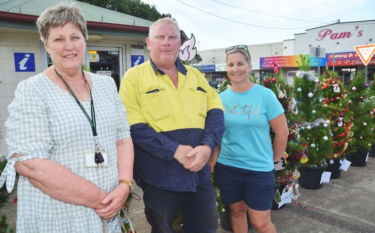 The 10 trees lined up ready to be auctionedLorraine Goodchild and Cr Heath Sander, from the Murgon Business & Development Association, with Murgon Services Club treasurer Kimberley Kunde … the MBDA, Murgon Services Club and Cr Sander sponsored the eventAuctioneer Josh Steinhardt with Murgon resident Bryce Swift who was preparing to bid on the treesThe children from Wheatlands State School were particularly proud of their decorated tree!