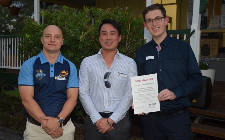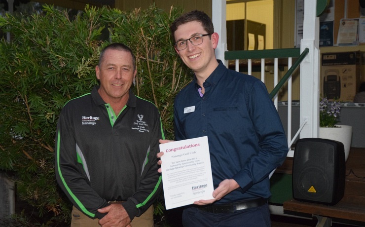 Heritage Nanango Community Branch manager Lochlan Ezzy, right, with Shaun Dati and William Kok from Nanango State High School … grants were received for a defensive driving course for students, fans in the Trade Training Centre, the HPV program, goal post wraps and an oven for the tuckshopCraig Sanders from Nanango Golf Club …support was received for the Monthly Mug and golf cartsNanango Show Society … for sponsorship of the annual show for three years (Lochlan was joined for the remainder of the photographs with staff members from the Heritage branch)South Burnett Regional Council … for pool pod at the South Burnett Aquatic Centre, Nanango Nanango Theatre Company … for car park upgrade and NananGO PLAYfest sponsorship (Year 2 of three years)Nanango Campdraft … sponsorship of the Open draft (Year 1 of three years)Nanango QCWA … for painting of the clubroom buildingWaterhole Rocks … sponsorship of the annual rock’n’roll festivalNanango Hospital Auxiliary … to purchase CD players and gazeboNanango State School and Nanango State School P&C … for goal posts, musical instruments and booksNanango Business Alliance … sponsorship of the annual Australia Day eventNanango Rugby League Football Club … to upgrade facilitiesNanango Community Baptist Church and Nanango Men’s Shed … to purchase a ride-on mowerNanango Swimming Club … to purchase club polo shirts