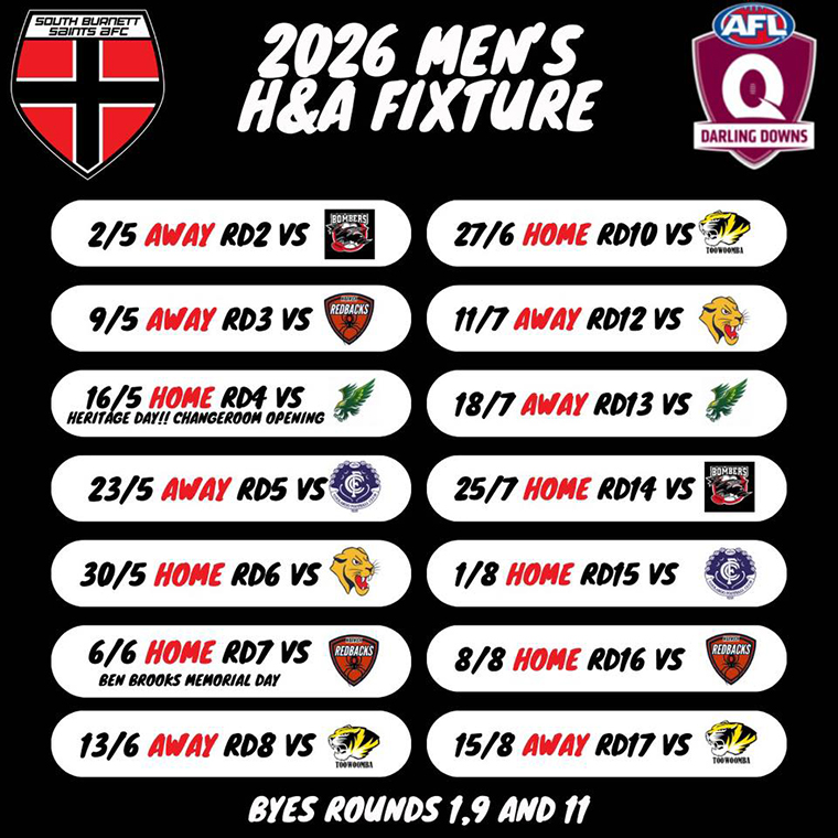 The South Burnett Saints have been allocated seven home games during the 2026 Darling Downs AFL season.