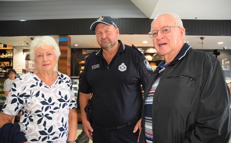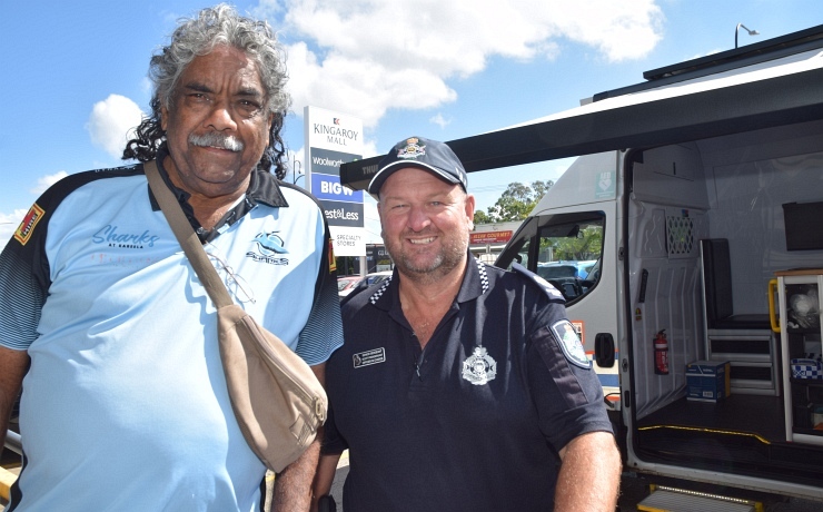 Cherbourg Elder Uncle Frank Malone with Kingaroy Officer-In-Charge Senior Sergeant Scott PrendergastLooking after the Mobile Police Beat van were Amelia Cutmore, (Toowoomba); Jael Callaghan (Kingaroy Station) and Senior Sergeant Jason Hopgood (Toowoomba QPS)Members of the local branch of the Ulysses social motorcycle club and their family members took the opportunity to share a coffee with a cop at Muffin Break in the Kingaroy MallSenior Sergeant Scott Prendergast with Wondai residents Margaret and Winston Burrows who are still shaken after a break-in at their home last month