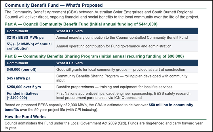 Australian Solar Enterprises (ASE) took the opportunity of the gathering to present its proposed Community Benefit Fund, which has been updated to reflect the inclusion of a 2000MW Battery Energy Storage System (BESS) in the project alongside the 400MW solar farm.