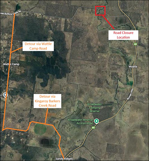 November 13, 2025 - With immediate effect, Council advises that Memerambi-Barkers Creek Bridge over Barker Creek, on Memerambi-Barkers Creek Road, will be closed to all users. Council has identified a defect with the bridge structure and will be undertaking unscheduled repair works. To safely undertake these urgent repairs, vehicular access will be temporarily closed at this location. Please refer to the map below for the specific closure area.There are alternative routes available via Wattle Camp Road on the western side of the bridge and Kingaroy-Barkers Creek Road on the eastern side of the bridge. Council apologises in advance for any inconvenience this work may cause, and appreciates your patience while works are in progress. For any information, please contact Council’s Infrastructure department on (07) 4189-9100 or by email |